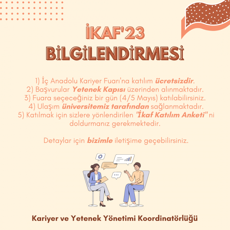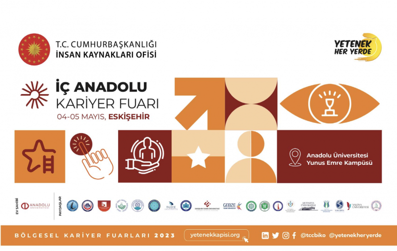 Hundreds of companies, job and internship opportunities, interview simulations, seminars, workshops, technical tours and many more activities await you at the Central Anatolia Career Fair, which will be held in Eskişehir on May 4-5 under the coordination of the Human Resources Office of the Presidency of the Republic of Turkey and hosted by Anadolu University. To participate in the Central Anatolia Career Fair, you can register at yetenekkapisi.org and complete your İKAF'23 application.
