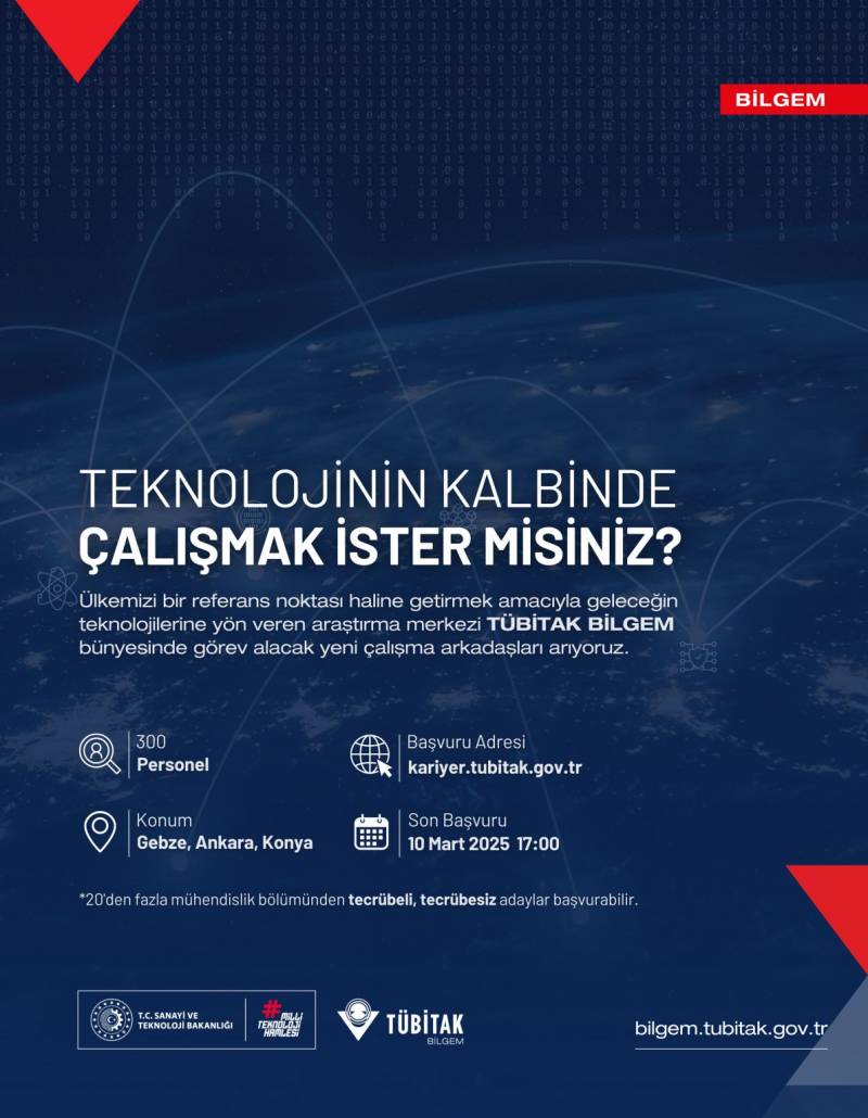 TÜBİTAK BİLGEM is looking for new teammates to work in critical areas such as artificial intelligence, cyber security, electronic warfare, cryptology, radar, blockchain, avionics and quantum technologies.